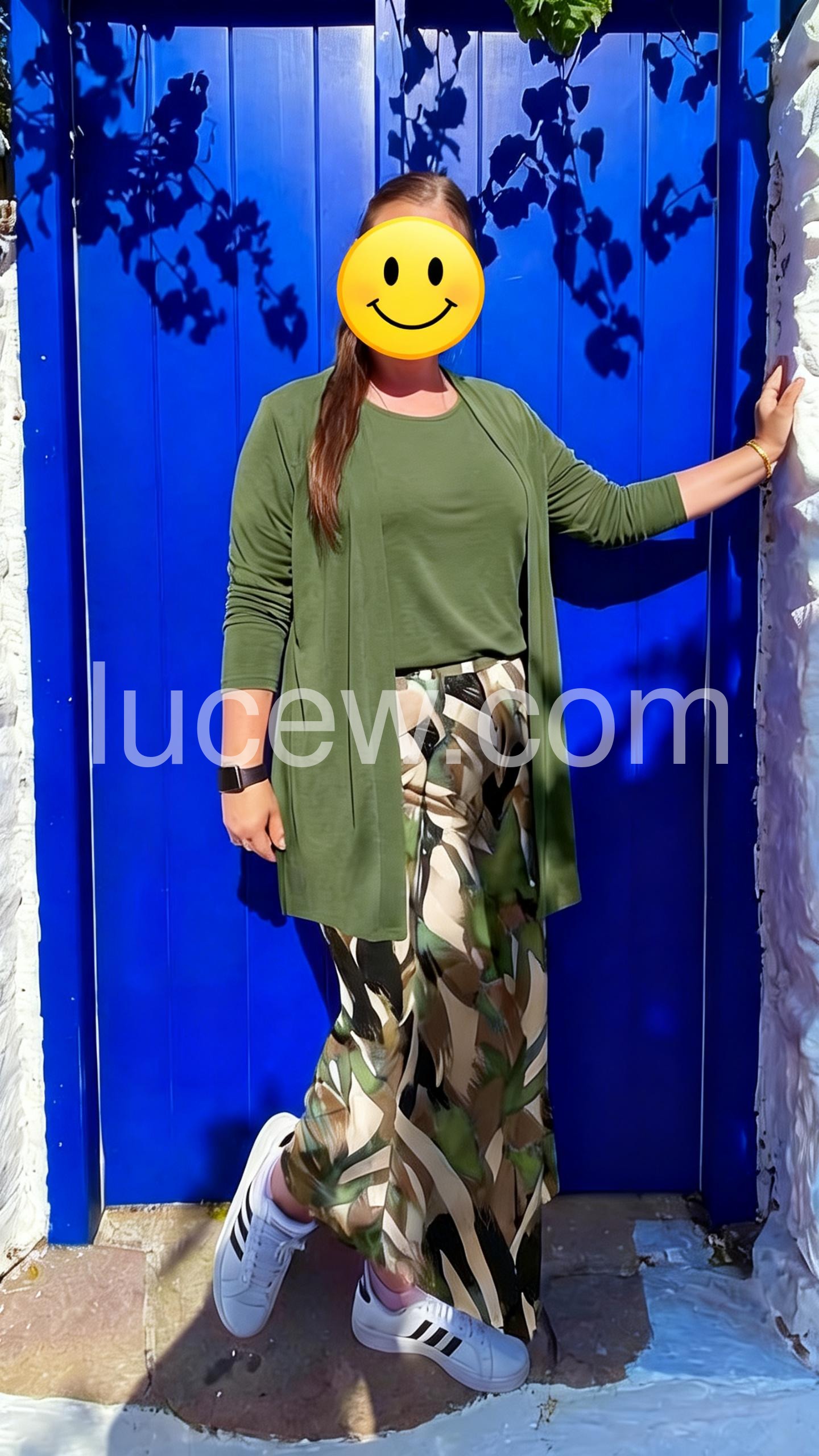 This three-piece set features a solid green top, matching open-front cardigan, and wide-leg pants with a bold tropical leaf print. The relaxed silhouette offers comfort and style. Perfect for casual outings or warm-weather wear. Lightweight fabric ideal for everyday elegance. Effortlessly chic and easy to wear.