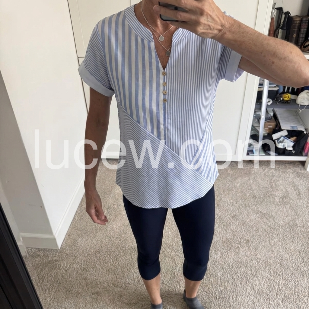 This short-sleeve top features vertical blue and white stripes. V-neckline with front buttons and a stylish wrap design. Cuffed sleeves add a polished touch. Lightweight and perfect for casual wear. Ideal paired with jeans or trousers.