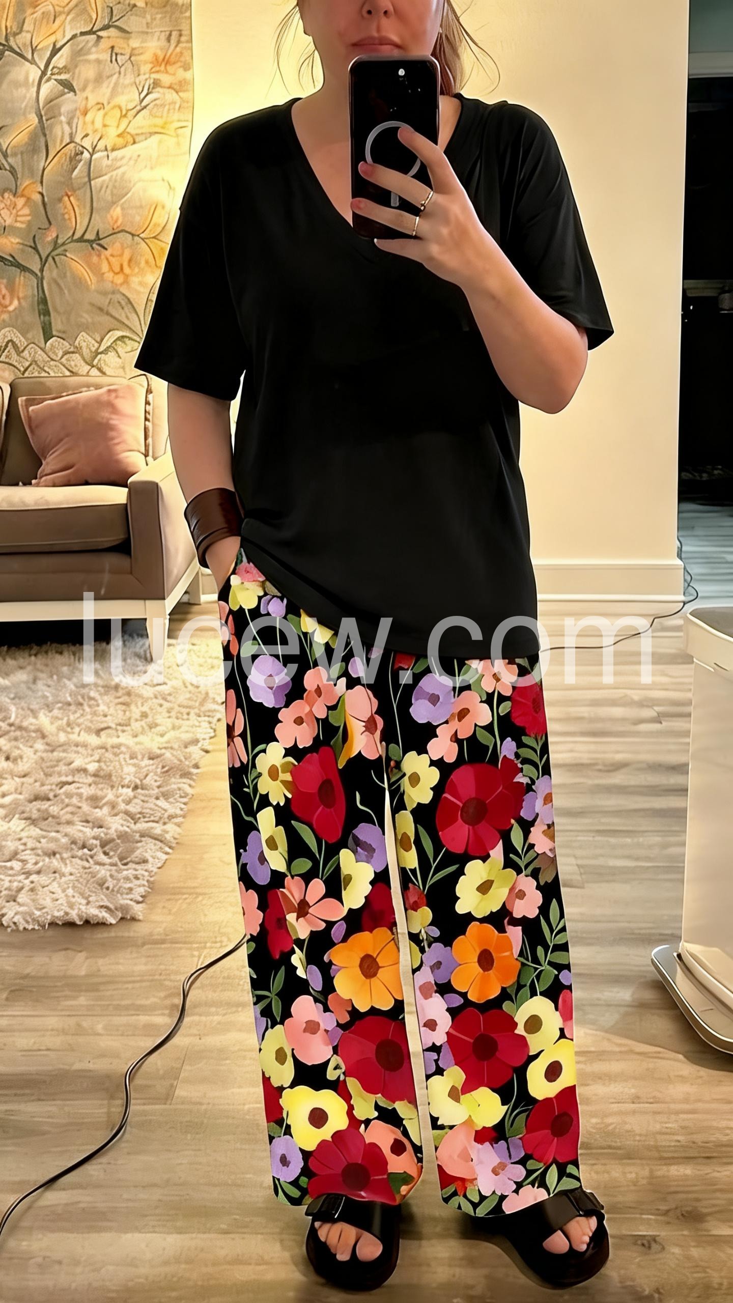 I absolutely love this set! The wide-leg floral pants are incredibly comfortable and breathable, perfect for summer weather. The best part? They have pockets! The black V-neck top is simple but pairs so well with the vibrant bottoms. Highly recommend!
