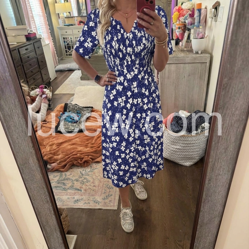 This dress solves the “cute but comfortable” dilemma with ease. The ditsy white floral print on a navy base feels fresh and summery, while the smocked waist creates a flattering silhouette. The gathered detail cinches the waist without feeling tight.