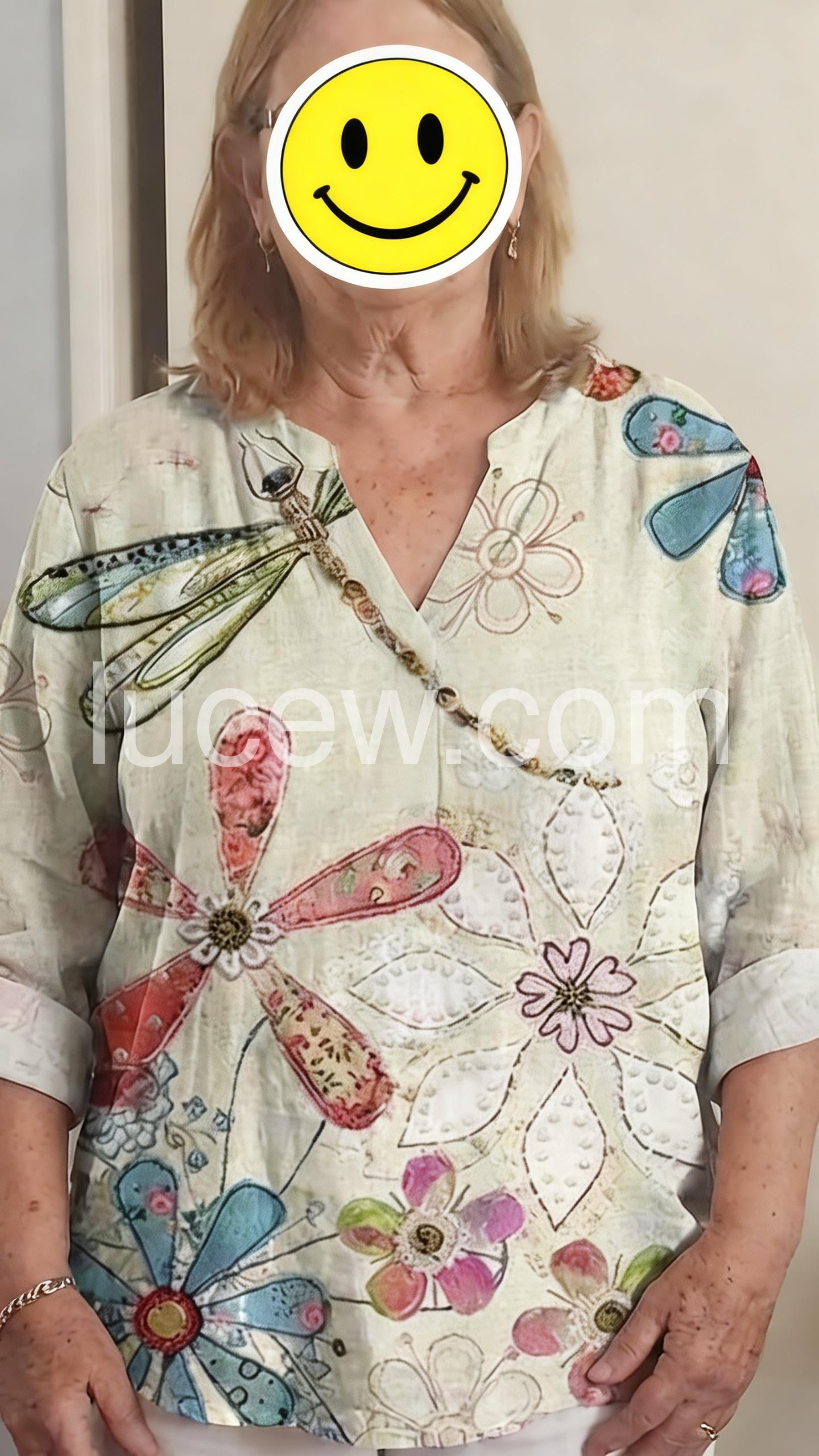 This loose-fitting top features a colorful floral and dragonfly print on a soft neutral base. V-neck with button detail adds a relaxed charm. Long sleeves with rolled cuffs for easy styling. Lightweight and perfect for warm days. Effortlessly bohemian with artistic flair.