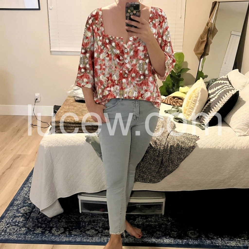 Love this top! The material is lightweight and breathable, perfect for summer. The square neckline with the buttons adds a nice touch.