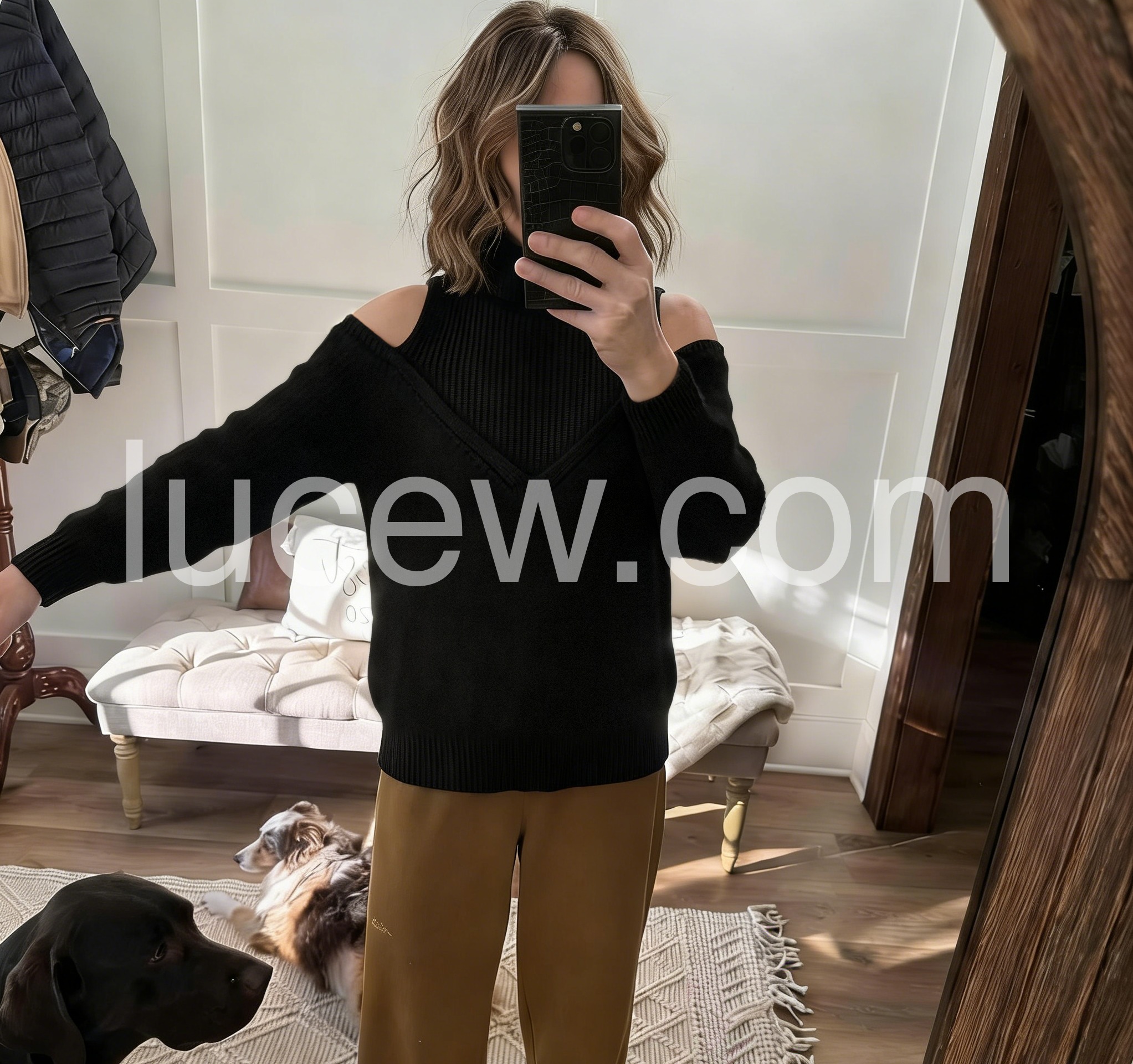 I absolutely love the cutout shoulder detail! It adds such a fun, edgy vibe to a classic black turtleneck. The material is super soft and isn't scratchy at all. Highly recommend!