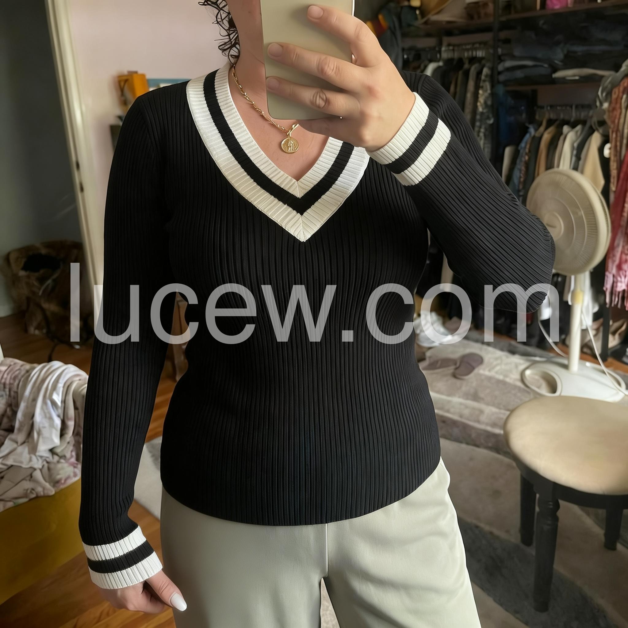 I’m obsessed with this design! The contrasting stripes at the collar, cuffs, and hem give it such a chic, timeless vibe without looking overly busy. The fit feels smooth and well-shaped, and the long sleeves are perfect for cooler weather. I also appreciate how the sweater holds its form after wearing, so it doesn’t look messy. It’s become one of my go-to pieces already.