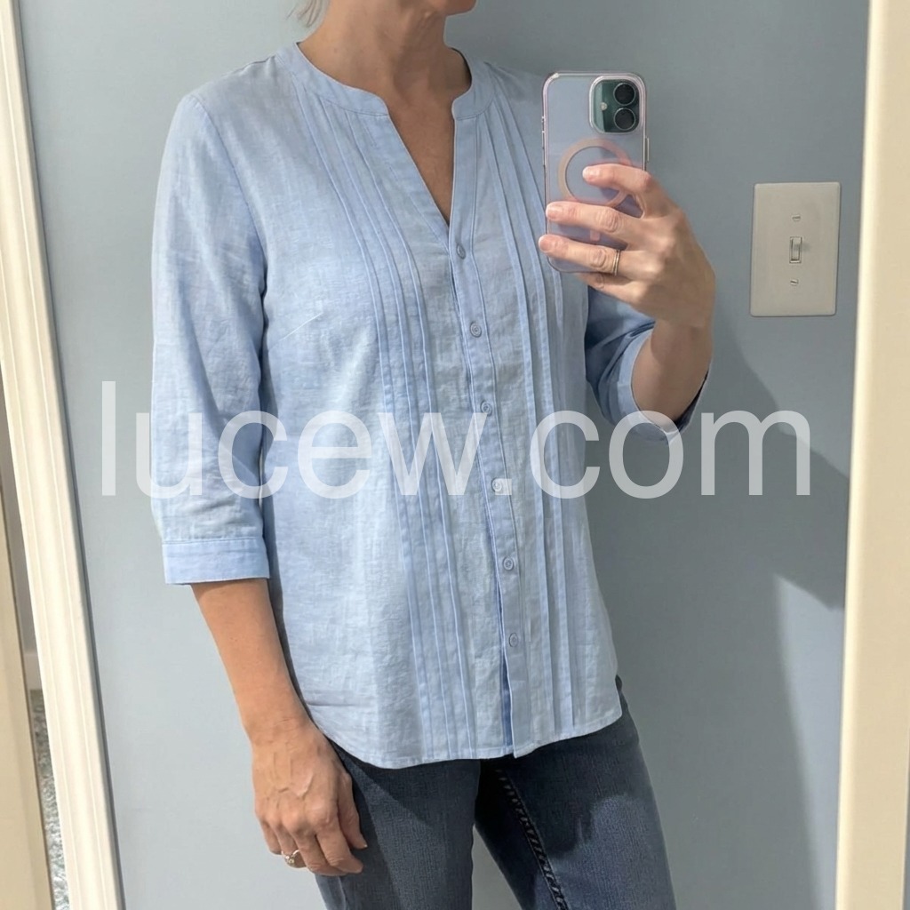 The round notched V-neck, vertical front pleats, and full button placket create a polished, structured silhouette, while the 3/4 cuffed sleeves offer versatile styling.