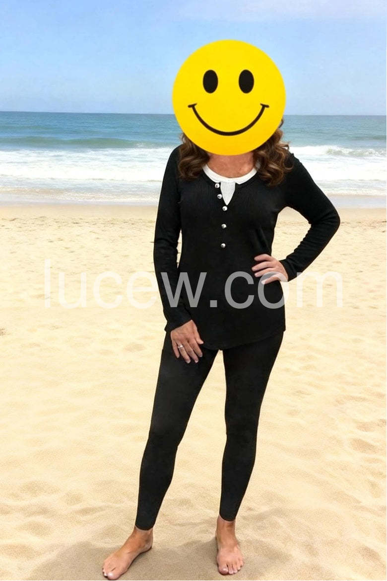 This expertly designed long sleeve top combines classic sophistication with modern versatility. The black foundation is enhanced by crisp white trim framing the collar and hem, creating a refined two-tone aesthetic that commands attention. The structured neckline and tailored silhouette project confidence and professionalism, making it an indispensable piece for contemporary wardrobes. Whether styled with formal separates or casual basics, this top delivers polished results. The quality construction ensures durability and lasting appeal, while the timeless color blocking transcends seasonal trends. An investment piece that anchors any collection with understated luxury.