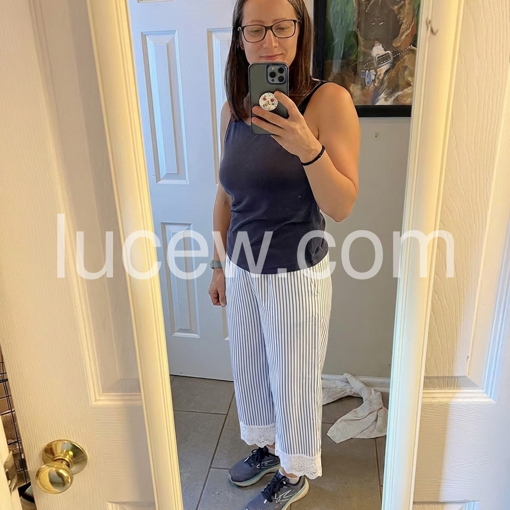 These relaxed-fit pants feature vertical blue and white stripes with a delicate lace trim at the hem. Elastic waistband and side pockets for comfort. Lightweight fabric perfect for warm weather. Ideal for beach days or casual outings. Effortlessly stylish and breezy.