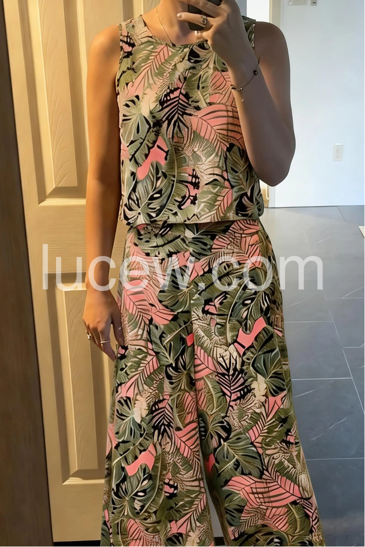 This coordinated set features a sleeveless crop top and wide-leg pants in a bold tropical leaf print. The mix of green, pink, and black creates a lively summer vibe. Lightweight fabric for comfort and ease. Perfect for beach days or casual outings. Effortlessly stylish with a nature-inspired flair.