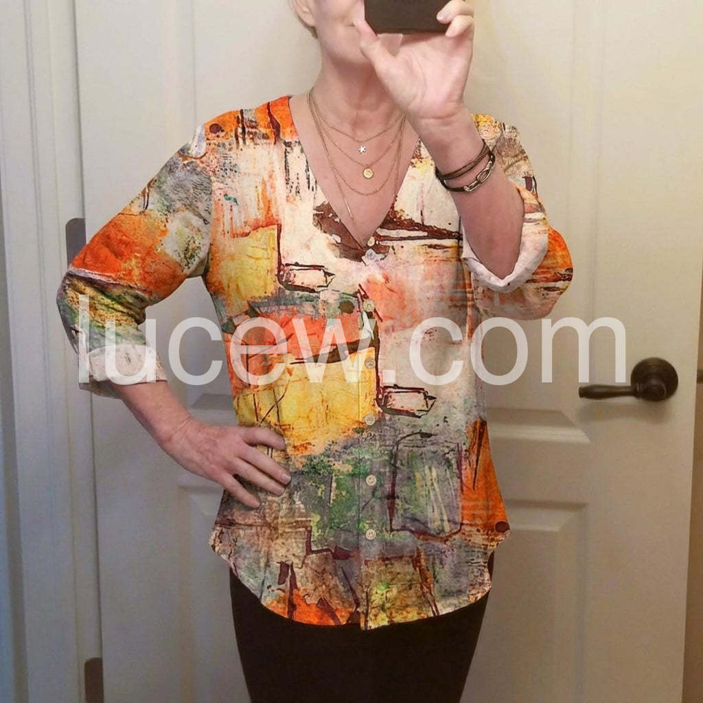 am obsessed with this watercolor print blouse! The blend of warm oranges, soft yellows, and subtle greens creates a stunning, artistic look that stands out without being overwhelming. The V-neck design is incredibly flattering. The fabric is lightweight, breathable, and has a lovely drape—no stiffness at all! It pairs seamlessly with jeans for a casual day out or dress pants for the office. The fit is true to size, and the small button detail adds a charming touch. I’ve already gotten multiple compliments and will definitely be buying more colors!