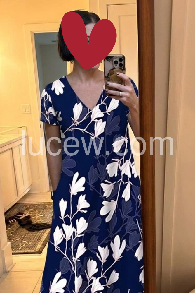 This flowing midi dress features a deep navy base with white floral prints. V-neckline and short sleeves for a flattering fit. Side pockets add practicality and ease. Lightweight fabric perfect for summer days. Ideal for beach outings or casual gatherings.