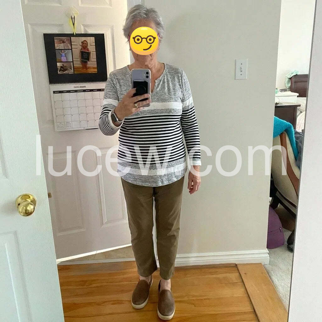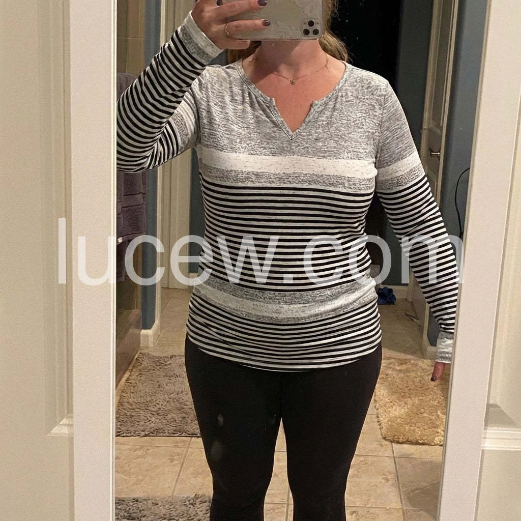 This Youthful Notched Neck Striped Print Long Sleeve Top combines a modern silhouette with timeless style. Designed with a distinctive notched neckline and classic horizontal stripes, it offers a refined yet casual look. The long sleeves provide comfort and versatility, making it a practical choice for layering or standalone wear. Ideal for everyday sophistication, this top complements both relaxed and polished outfits with ease.