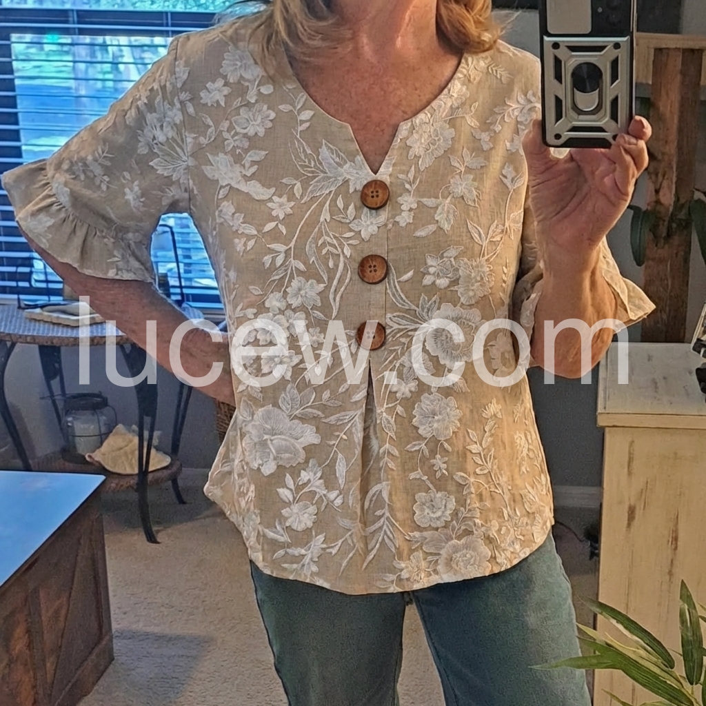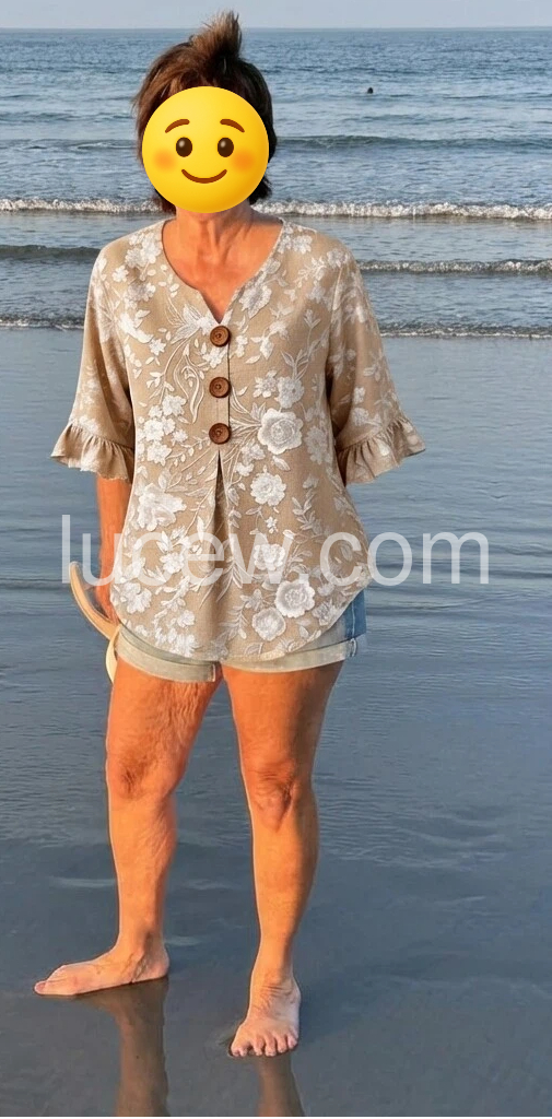 This V-neck top features delicate white floral Print on a soft beige base. Front button closure with wooden buttons and flared ruffle sleeves. Lightweight fabric perfect for warm days. Relaxed fit with a feminine touch. Ideal for casual wear or resort style.