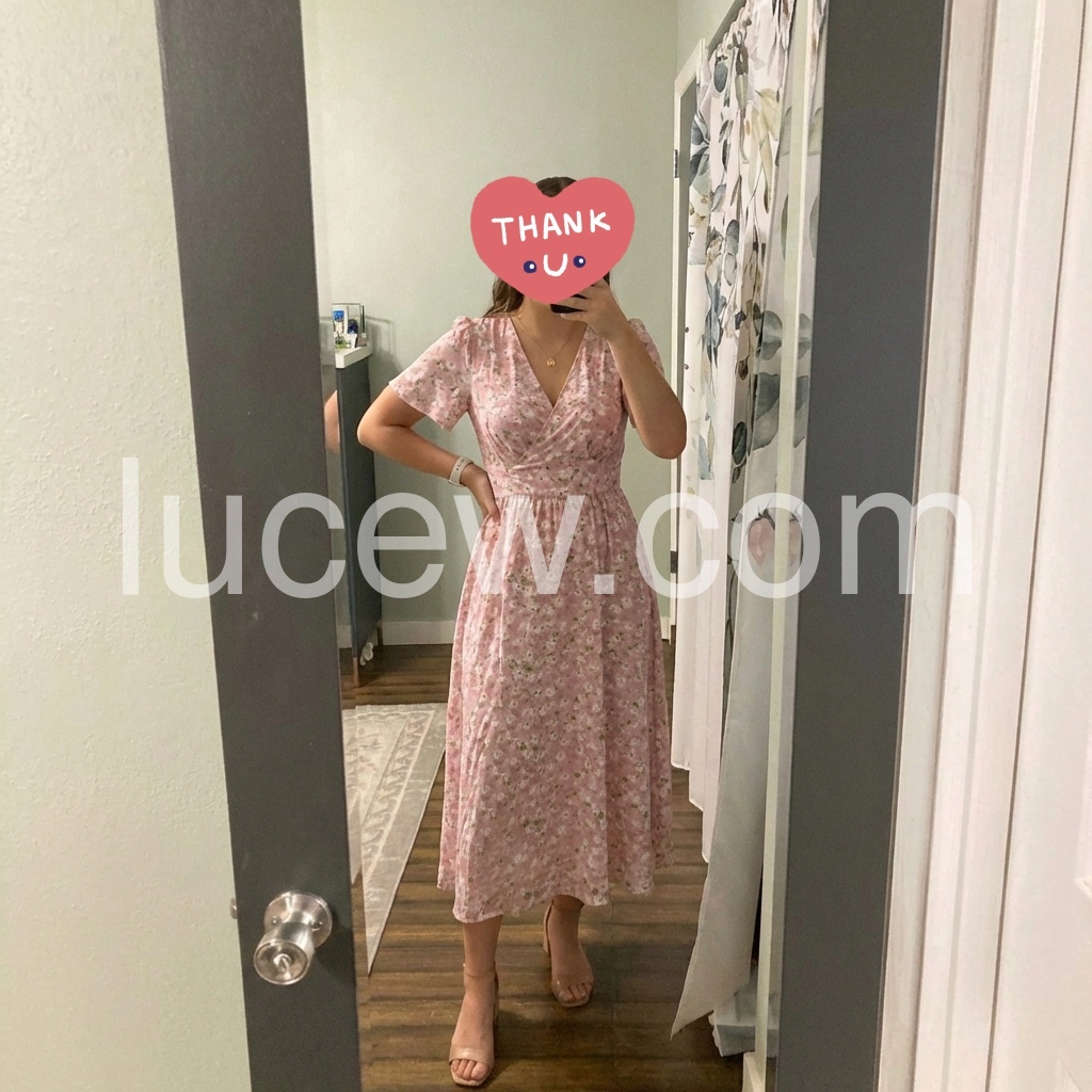 This mid-length dress features a soft pink base with delicate white floral prints. V-neckline and short flutter sleeves add feminine charm. Wrapped front design with a defined waist for a flattering fit. Lightweight fabric perfect for warm days. Ideal for brunches, garden parties, or casual outings.