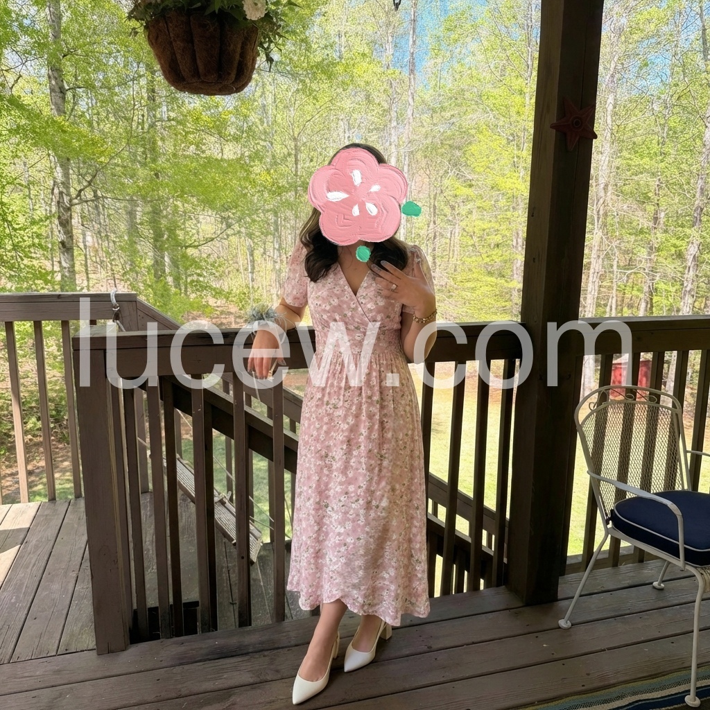 This dress is absolutely stunning! The light pink color and delicate floral print are perfect for spring. It fits true to size and the v-neck isn't too low.