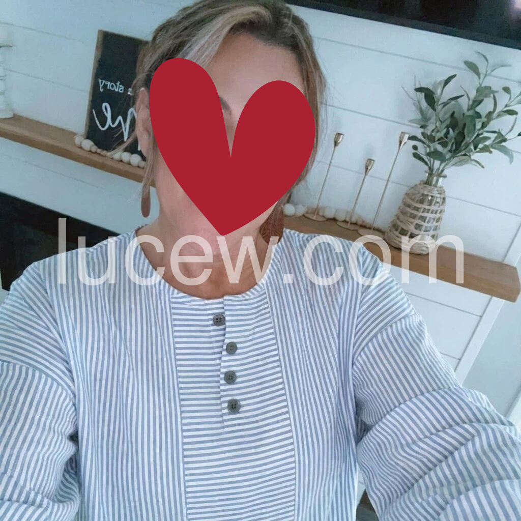 This long-sleeve top features a clean blue-and-white vertical stripe pattern with a buttoned placket. The relaxed fit and wide sleeves offer comfort and ease. Soft fabric perfect for casual wear. Ideal for pairing with jeans or pants. Simple, modern, and effortlessly chic.