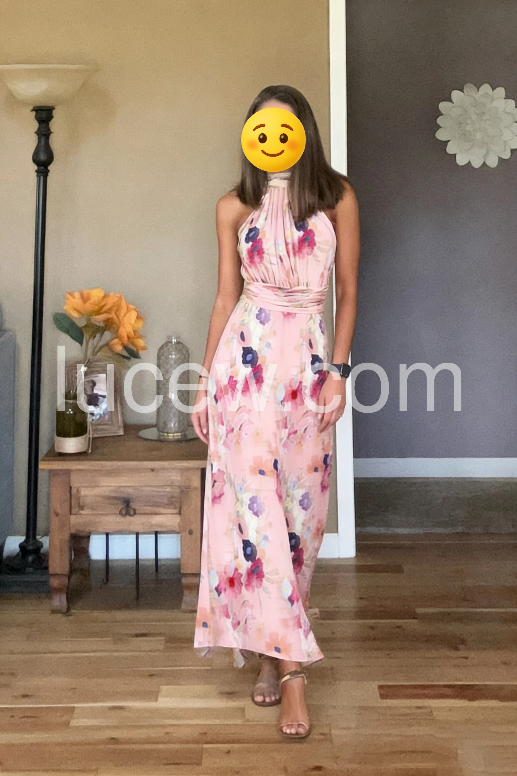This halter-neck maxi dress features a soft pink base with vibrant floral prints. The ruched neckline and fitted waist highlight the silhouette. Lightweight fabric drapes beautifully for movement. Perfect for formal events or summer soirées. Effortlessly chic and feminine.