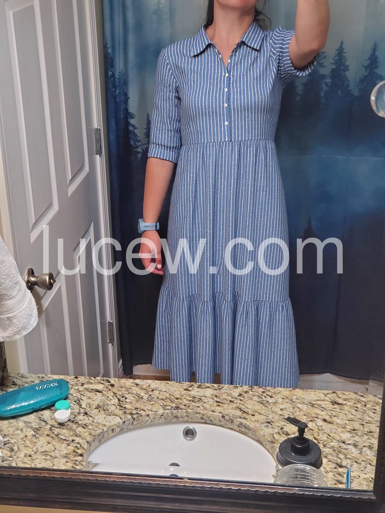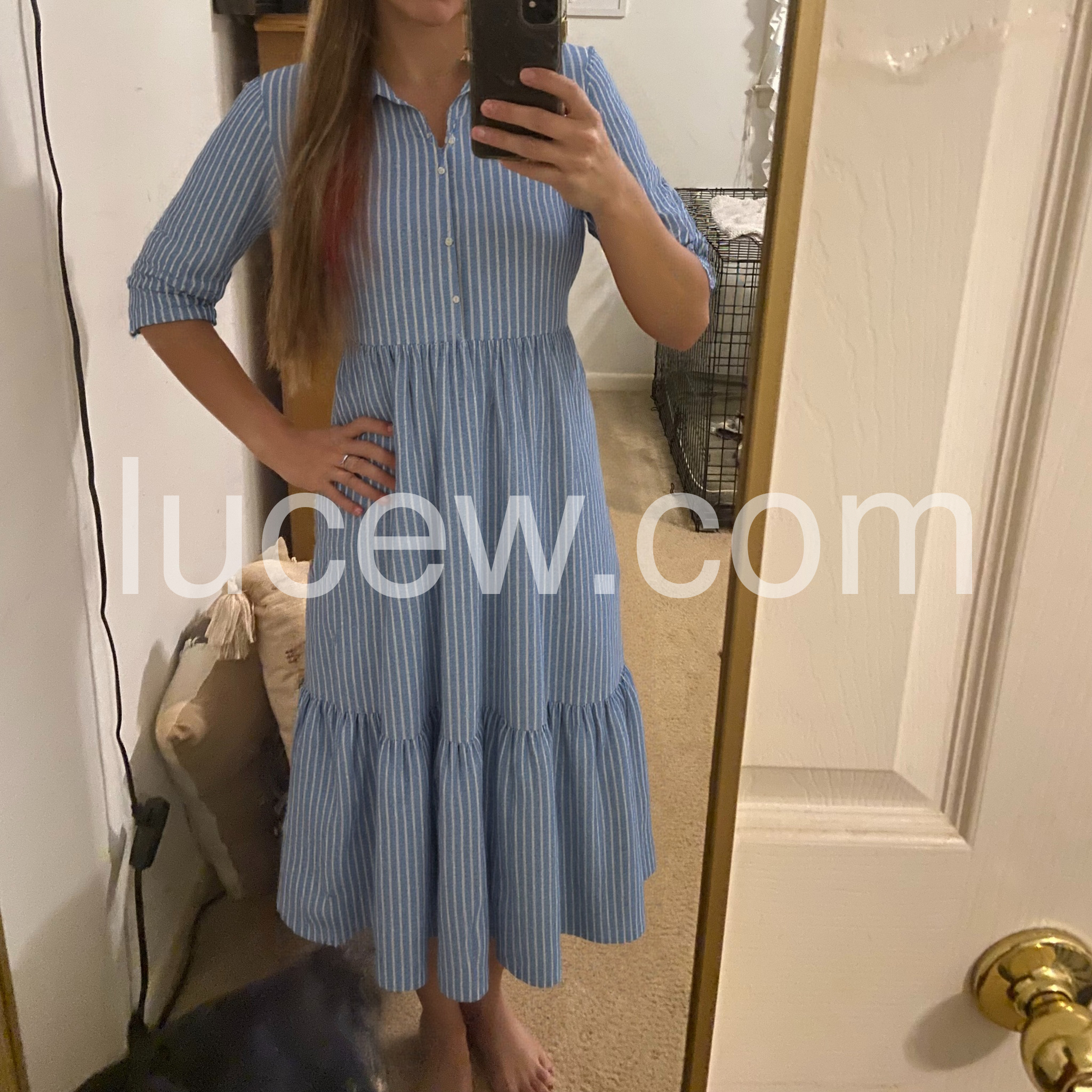 Absolutely love this dress! The light blue and white stripes give it such a classic, beachy vibe. It is incredibly comfortable and flowy, perfect for hot summer days. I paired it with a straw bag just like the picture and got so many compliments.